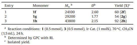 To further demonstrate the utility of our methodology, a gram scale reaction was conducted, as shown in Scheme S4 (Supporting information). When monomer 3 (3 mmol) and 1h (3 mmol) were used, a polymer with Mn of 32400 was provided in 87% yield. The Mn was slightly lower than that of the polymerization on small scale. Moreover, pre-polymerization step was also tried, as shown in Scheme S5 (Supporting information). When monomer 3 and 1h were used in the ratio of 1:1.2, both ends of the product 2j (Mn = 11400, Ð = 1.45) should be terminated by OH groups. When the ratio was 1.2:1, both ends of the product 2k (Mn = 6900, Ð = 1.60) should be terminated by SiH groups. The further polymerization employed prepolymers 2j and 2k, providing polymer 2l with higher Mn (yield = 51%, Mn = 17800).