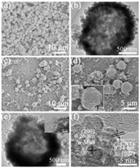 | Fig. 1. (a) SEM image and (b) TEM image of pure MnS; (c, d and the inset) SEM images, (e and the inset) TEM images and (f) HRTEM image of hollow MnS/CNTs composite. | |