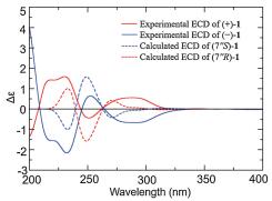 | Fig. 4. Experimental ECD spectra of (+)-1 and (-)-1 and calculated ECD spectra of (7"R)-1 and (7"S)-1. | |