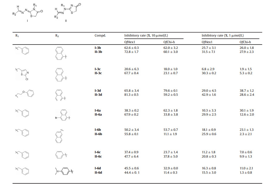 The inhibitory activities of thiazolylhydrazone derivatives I and II against OfHex1 and OfChi-h are outlined in Table 1. Some of the compounds exhibited good inhibitory activities at 1 μmol/L and 10 μmol/L. Our previous work investigating the structure-activity relationships of the thiazolylhydrazone derivatives I against OfHex1 reported the stretched conformation. Interestingly, the branched conformation of thiazolylhydrazone derivatives II, with aromatic groups at the N2 atom, such as benzyl (3b) and phenoxyethyl (3d), exhibited potent inhibitory activity. Further studies then focused on the naphthalene ring R2. The inhibitory activities of the resultant derivatives were weakly influenced by either the substitutes or their position on the naphthalene ring (compare 3b with 6a and 6b). However, replacement of the naphthalene ring with benzene, as in compounds 6c and 6d, resulted in a significant inhibitory activity decrease. Gratifyingly, it was found that the thiazolylhydrazone derivatives I and II exhibited promising inhibitory activity against OfChi-h. In particular, compounds I-3d and II-3d were found to display considerable activity against OfHex1 and OfChi-h (Fig. 2).