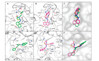 | Fig. 3. Proposed binding modes of compounds I-3d and II-3d to the enzymes OfHex1 and OfChi-h respectively: (A) Binding mode I-3d in the active pocket of OfHex1. The compound I-3d was shown in green. The hydrogen bonds were shown in black dashes. (B) Binding mode of II-3d in the active pocket of OfHex1. The compound II-3d was shown in magenta. (C) Superimposition of compound I-3d and II-3d in the active pocket of OfHex1. (D) Binding mode I-3d in the active pocket of OfChi-h. (E) Binding mode of II-3d in the active pocket of OfChi-h. (F) Superimposition of compounds I-3d and II-3d in the active pocket of OfChi-h. | |
