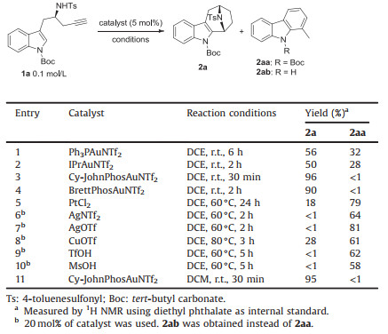 At the outset, Boc-protected indole tethered chiral homopropargyl amide 1a was chosen as the model substrate (Table 1). To our delight, typical gold catalysts such as Ph3PAuNTf2 and IPrAuNTf2 could indeed catalyze the cascade cyclization reaction to produce the desired aza-[3.2.1] skeleton 2a, albeit along with the byproduct 2aa, which was formed presumably through a direct gold-catalyzed Markovnikov cycloisomerization-initiated tandem reaction (entries 1 and 2; Supporting information for details). We then investigated other gold catalysts and were delighted to find that excellent yields were achieved by employing Cy-JohnPhosAuNTf2 and BrettPhosAuNTf2 as catalysts (entries 3 and 4). Of note, by employing PtCl2 as the catalyst, the occurrence of 2aa could become dominant (entry 5). In contrast to the gold catalysts, other transition metal catalysts and Brønsted acids promoted selective formation of 2ab (entries 6–10) [10]. Finally, it was found that the reaction proceeded equally well in DCM as the solvent (entry 11).