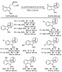 Herein, we disclose a gold-catalyzed anti-Markovnikov cycloisomerization-initiated tandem reaction by employing the Bocprotected indole tethered homopropargyl amides as substrates [8, 9], enabling facile access to a wide range of valuable bridged aza-[n.2.1] skeletons (n = 3–7) at room temperature with high diastereoselectivity and enantioselectivity by a chirality-transfer strategy.