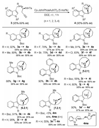 | Scheme 4. Synthesis of bridged aza-[3.2.1] skeletons 4. Reactions run in vials; [3] = 0.1 mol/L, isolated yields are reported. | |