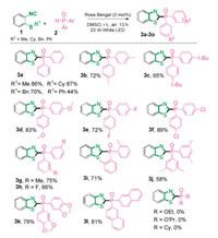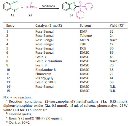 To identify the optimal reaction conditions, we commenced our investigation with the synthesis of 3a by the treatment of (2-isocyano-phenyl)(methyl)sulfane (1a) and diphenylphosphine oxide (2a) at room temperature under an air atmosphere (Table 1). After irradiation with 23 W white LED light for 13 h, an initial attempt found that the cascade reaction gave the target product 3a in 32% yield when using Rose Bengal as photocatalyst and DMF as solvent. Motivated by this result, a screening of the solvents was further performed to enhance reactivity (entries 2-6). The results revealed that DMSO is the best solvent for this transformation. Afterward, various photocatalysts including Eosin Y, Eosin Y disodium, Eosin B, Rhodamine B, and Fluorecein were examined under the same conditions, affording 3a in lower yields than 86% (entries 7-11). In addition, replacing organic photocatalysts with metal-photocatalyst shows less activity (entry 12). Interestingly enough, the two substrates successfully transform to 3a in 59% yield when utilizing Eosin Y/TBHP as catalytic system[6h]. Besides, switching conditions to dark at 90 ℃ shut down the reaction (entry 14, condition e). Lower yields were obtained when shortening the reaction time to 7 h or changing light source to sunlight (34% and 16% corresponding). Finally, two control experiments were conducted to prove that photocatalyst and visible light are essential for the concomitant C(sp3)-S bond cleavage and imidoyl C-S formation in the absence of Rose Bengal or visible light.