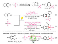 Organophosphorus compounds have wide applications in organic synthesis, biochemistry and medicinal chemistry [1], where phosphorus substituents play as ligands, directing group for transition metal catalysis or π-conjugated materials [2]. As a consequence, the introduction of organophosphorus groups in convenient means continues to stimulate methods for their synthesis [3]. Among which, the addition of P-centered radicals to unsaturated bonds has become one of the most used reactions for the construction of phosphorus-containing compounds, but an extra equivalent of promoter (such as Ag(Ⅰ), Mn(Ⅲ), or peroxides) or catalytic quantity of metal catalyst and high reaction temperature were usually utilized, resulting in a waste of energy and limitations of the utilization [4]. For instance, Yang and coworkers reported a silver-catalyzed radical carbon phosphorylation of alkenes with H-phosphorus oxides for construction of phosphorylated oxindoles [4f]. For these reasons, more and more attentions have been paid to search for green and efficient approaches for introduction of organophosphorus backbones during the past decade. Meanwhile, the application of visible-light photoredox catalysis has regained substantial attention during the last decade due to its operational simplicity to carry out synthetic transformations in an environ-mentally benign and sustainability [5]. This photocatalytic transformation meets mild reaction conditions and green chemistry, providing an alternative for assembling phosphorus-containing molecules [6].