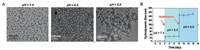| Fig. 3. (A) TEM images of clusters at pH 7.4, 6.5 and 5.0. (B) DLS measurements of Ox-POM clusters with successive acidifications from pH 7.4 to 6.5 and to 5.0. Reproduced with permission [49]. Copyright 2017, American Chemical Society. | |