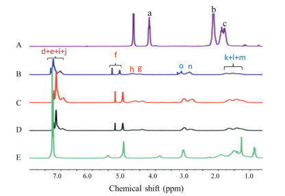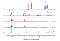 | Fig. 1. 1H NMR spectra of (A) PG, (B) PLL:PPhe (30:60), (C) PLL:PPhe (30:40), (D) PLL: PPhe (30:20), (E) PLL(Z). | |