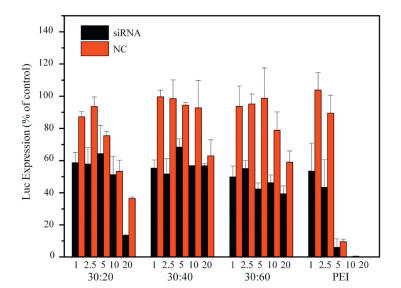 The transfection performance of PLL-b-PPhe was mainly evaluated by a siRNA silencing in vitro. The HeLa-luc cells that persistently express of luciferase were used for transfection with selected gene Bcl2 siRNA and the non-acting gene NC siRNA. The transfection performance of the materials was evaluated by the difference between the silencing efficiency of Bcl2 siRNA and NC siRNA. Fig. 2 showed the results of transfection with different molar ratios of PLL-b-PPhe at 24 h, in which the low expression of luciferase proved that the material had a high silencing effect. And the high silencing efficiency of materials by NC siRNA indicated that the material was highly toxic. The result indicated PLL-b-PPhe/ Bcl2 siRNA had the similar silencing effect on the express of luciferase as PEI, especially in PLL-b-PPhe with a molar ratio of 30:60. When the mass ratio of PLL-b-PPhe to Bcl2 siRNA was 5:1, it had the best silencing effect.