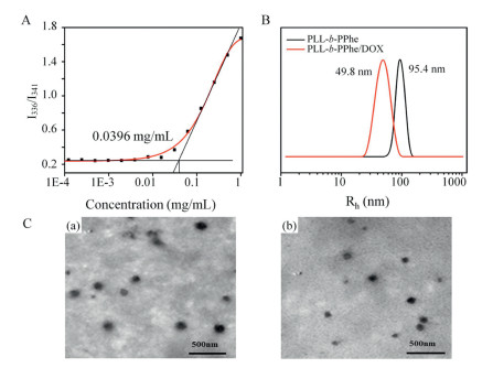 | Fig. 3. (A) The critical micelle concentration (CMC) of PLL-b-PPhe. (B) The hydrodynamic radii (Rh) of PLL-b-PPhe and PLL-b-PPhe/DOX. (C) The TEM images of (a) PLL-b-PPhe (b) PLL-b-PPhe/DOX. | |