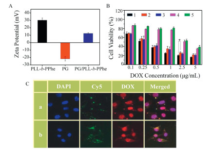 | Fig. 5. (A) Zeta potential of PLL-b-PPhe, PG and PG/PLL-b-PPhe. (B) Synergistic therapeutic effect of PG/PLL-b-PPhe/DOX/Bcl2 siRNA (1: PG/PLL-b-PPhe/DOX/Bcl2 siRNA, 2: PG/PLL-b-PPhe/DOX/NC siRNA, 3: PG/PLL-b-PPhe/DOX, 4: PG/PLL-b-PPhe/ Bcl2 siRNA, 5: PG/PLL-b-PPhe/NC siRNA, *P < 0.05). (C) Cell uptake of PG/PLL-b-PPhe/DOX/Cy5 siRNA (a: 3 h, b: 24 h). | |