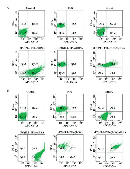 The cell uptake of PG/PLL-b-PPhe/DOX/Cy5 siRNA was also studied by flow cytometry at 3 h and 24 h and shown in Fig. 6, where the ordinate was the fluorescence of DOX and the abscissa was the fluorescence emitted by the Cy5 siRNA. It was not difficult to find that the fluorescence absorption of PLL-b-PPhe/Cy5 siRNA was stronger than Cy5 siRNA alone, while PLL-b-PPhe/DOX also had stronger absorption than DOX. PLL-b-PPhe/DOX/Cy5 siRNA codelivery system had both higher gene and DOX endocytosis. Therefore, the co-delivery system was more efficient in delivering both genes and drugs into B16F10 cells simultaneously.