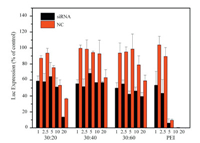 | Fig. 2. Transfection effect of different molar of PLL-b-PPhe. The PLL-b-PPhe/siRNA with different mass ratios (2.5:1, 5:1, 10:1, and 20:1) and PLL/PPhe molar ratios are 30:20, 30:40, 30:60 and PEI25k, respectively. | |