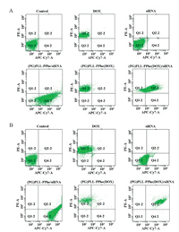 The cytotoxicity of the co-delivery system against B16F10 cells was investigated and showed in Fig. 5B. The viability of B16F10 cells decreased with DOX concentration increasing, and PG/PLL-b-PPhe/DOX/Bcl2 siRNA was more cytotoxic than PG/PLL-b-PPhe/ DOX and others. When the DOX concentration was increased to 1 μg/mL, the viability of B16F10 cells treated with PG/PLL-b-PPhe/ DOX/Bcl2 siRNA and PG/PLL-b-PPhe/DOX/NC siRNA had the most significant differences, indicated Bcl2 siRNA started to take effects. So the PG/PLL-b-PPhe/DOX/Bcl2 siRNA co-delivery system had the best killing effect on B16F10 cells.