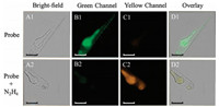 | Fig. 4. Images of NEPB in 3-day-old zebra fish. (A1-D1): Zebra fish incubated with probe NEPB (5.0 μmol/L) for 30 min. (A2-D2): Zebra fish treated with probe NEPB (5.0 μmol/L) and then incubated with N2H4 (1000.0 μmol/L) for 2 h. Green channel was collected from 500 nm to 550 nm and yellow channel was collected from 570 nm to 620 nm. λex = 390–420 nm. Scale bar = 500 μm. | |