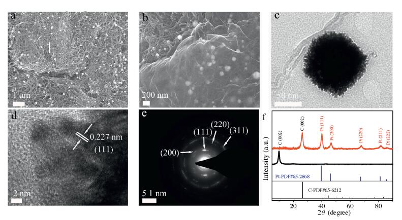 | Fig. 1. (a) SEM image and (b) cross-section SEM image of PtNP/rGO-MWCNT. (c) TEM image, (d) HRTEM image and (e) SAED pattern taken from PtNP/rGO-MWCNT, (f) XRD patterns of PtNP/rGO-MWCNT and GO. | |