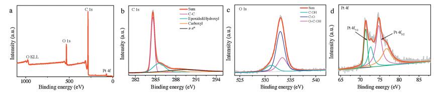 Fig. 3b shows the Fourier transform infrared spectroscopy (FT-IR) spectra of pure GO and PtNP/rGO-MWCNT. The broad peak at around 3442 cm-1 and a sharp peak at 1396 cm-1 are related to the stretching vibrations and deformation vibration of O—H on both spectra, respectively. The peaks at around 1720 cm-1, 1633 cm-1, 1230 cm-1 and 1041 cm-1 are assigned to the C=O stretching vibration, remaining sp2 skeletal vibration of C=C, C—OH stretching vibrations and C—O stretching vibration, respectively. However, all these characteristic peaks are weakened and even vanished completely for PtNP/rGO-MWCNT. While, the two peaks at 2922 cm-1 and 2853 cm-1 assigned to —CH2 and —CH stretching vibrations are stronger. This may be the absorption of AA on the surface of graphene [47-52]. All these characterization results confirm the removal of oxygen functionalities from the surface of GO as well as the formation of atomic frame of sp2 carbon in PtNP/rGO-MWCNT, thus proving the successful preparation of PtNP/rGO-MWCNT.