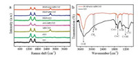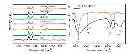 | Fig. 3. (a) Raman spectra of pure GO, rGO, pure MWCNT, rGO-MWCNT, PtNP/rGO, PtNP/MWCNT and PtNP/rGO-MWCNT. (b) FT-IR spectra of pure GO and PtNP/rGOMWCNT. | |