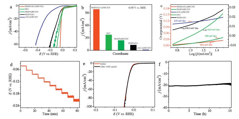 | Fig. 4. (a) Polarization curves of PtNP/rGO-MWCNT, Pt/C, PtNP/MWCNT, PtNP/rGO and rGO-MWCNT in 0.5 mol/L H2SO4 at a scan rate of 2 mV/s with iR correction. (b) Current densities at -0.05 V vs. RHE with iR correction. (c) Tafel plots of PtNP/rGO-MWCNT, Pt/C, PtNP/MWCNT, PtNP/rGO and rGO-MWCNT. (d) The multi-step chronopotentiometric curve of PtNP/rGO-MWCNT measured at the current densities between 20 mA/cm2 and 110 mA/cm2 with an increment of 10 mA/cm2 per 500 s. (e) Polarization curves of PtNP/rGO-MWCNTobtained before and after 1000-cycle CV in 0.5 mol/L H2SO4 with iR correction. (f) Time-dependent current density curve for PtNP/rGO-MWCNT at -45 mV (vs. RHE) in 0.5 mol/L H2SO4. | |