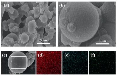 | Fig. 1. (a) SEM image of ANPPCs-700; (b) Enlarged image of ANPPCs-700; (c–f) SEM image of ANPPCs-700 and the elements mapping corresponding to C (d), N (e), O (f). | |