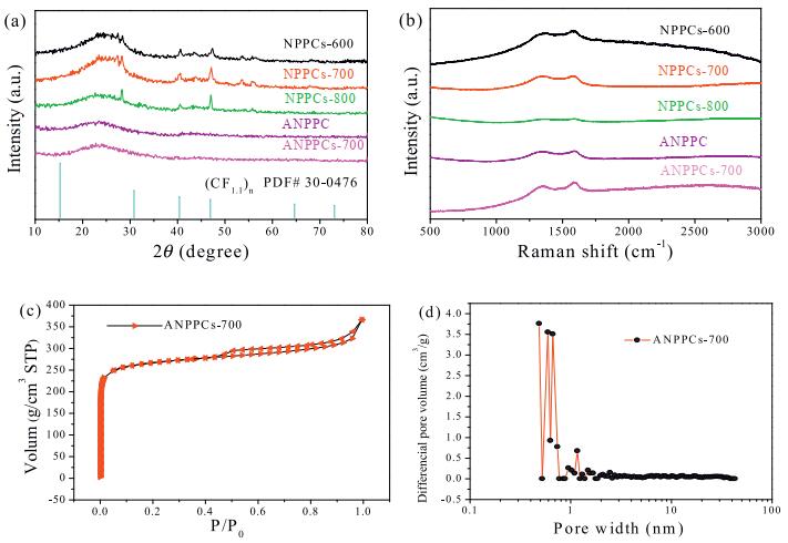 | Fig. 2. (a) XRD patterns and crystal structure analysis of the as-prepared materials; (b) Raman spectra of the as-prepared materials; (c) Nitrogen adsorption/desorption isotherms and (d) the pore size distribution curves of ANPPCs-700. | |