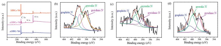 | Fig. 3. (a) The XPS survey scan of NPPCs-700, ANPPCs-700 and ANPPC-700; High-resolution N 1s XPS spectra of (b) NPPC-700, (c) ANPPCs-700, (d) ANPPC-700. | |