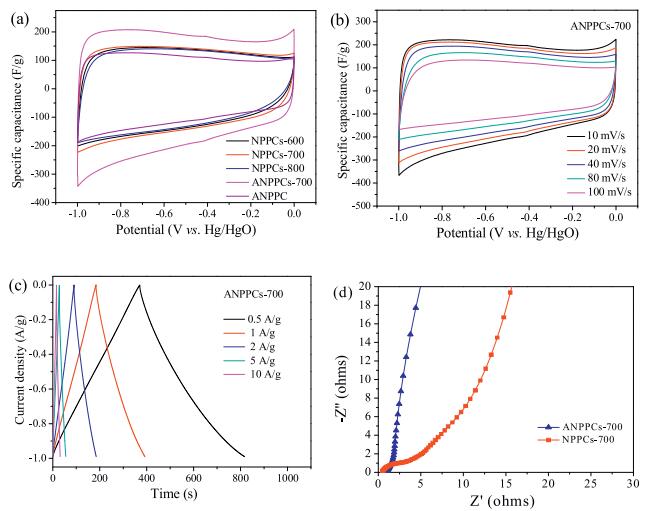 | Fig. 4. (a) The CV curves of NPPCs-600, NPPCs-700, NPPCs-800, ANPPCs-700 and ANPPC-700; (b) The CV curves of ANPPCs-700 at different scan rates; (c) The galvanostatic charge-discharge curve of ANPPCs-700 at diff; erent specific current density; (d) Nyquist plots of ANPPCs-700. | |