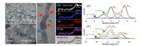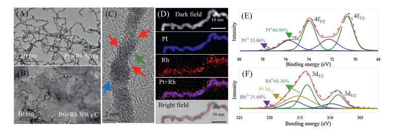 | Fig. 1. TEM of (A) Pt@Rh NWs and (B) Pt@Rh NWs/C; (C) HRTEM image of Pt NWs highlighted the presence of rich defect sites with arrows; (D) elemental mapping of Pt@Rh NWs using HAADF-STEM-EDS pattern; XPS spectra of Pt 4f (E) and Rh 3d (F). | |