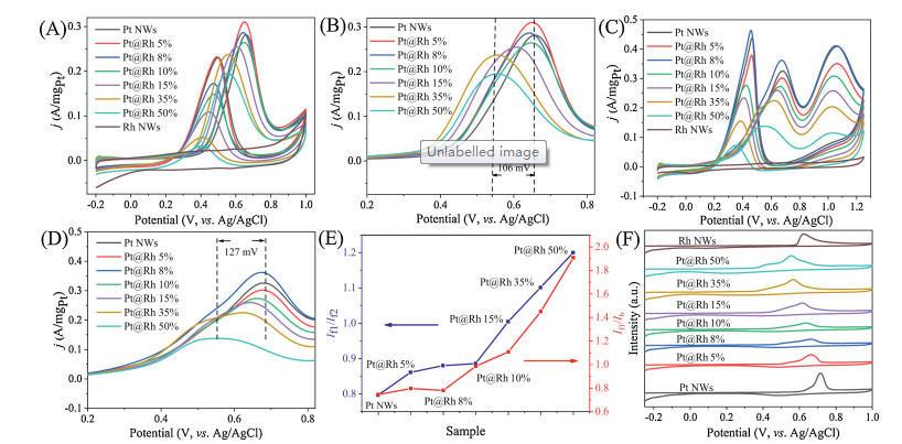 In summary, we demonstrated the successful preparation of defect-regulated Pt@Rh NWs, which use as effective oxidation electrocatalysts for alcohol fuel. It was verified that the defect sites were both acting as the reactive site and the main point of poisoning. By loading different amounts of Rh atoms onto the defect sites, the oxidation potential was effectively reduced, the accumulating of poison intermediates was also suppressed. What is more, the Rh atom effectively altered the structure of the defect site and improved the ability of the catalyst to electrooxidize the alcohol fuel. The catalyst not only completely oxidizes methanol but also promotes C—C bond cleavage of ethanol, resulting in their complete oxidation. Therefore, the defect blocking strategy significantly improved the activity of the catalyst as well as the product selectivity. In addition, the reaction process converts from the C2 path to the C1 path. This change allows the energy from the oxidation of the alcohol fuel to be completely converted. This work provides a new basis for the design and synthesis of novel catalysts for alcohol fuel oxidation.