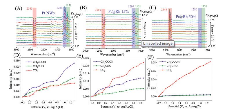 | Fig. 3. In situ FTIR spectra of the electrocatalysts for EOR and band intensities of CO2 (2343 cm-1), CH3COOH (1280 cm-1) and CH3CHO (1151 cm-1). | |