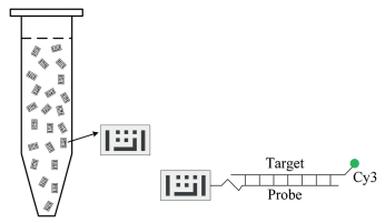 | Fig. 2. BMB array detection diagram. A probe coupled with BMB can be hybridized with single stranded products labeled with Cy3. | |