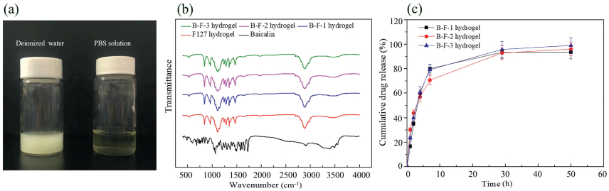 | Fig. 2. The preparation and characterization of baicalin/F127 hydrogel. (a) The photograph of baicalin dissolved in deionized water (left) and PBS solution (right). (b) ATR-FTIR spectra of baicalin, F127 hydrogel and different baicalin/F127 hydrogels. (c) Release profile of baicalin from baicalin/F127 hydrogels in PBS solution. | |
