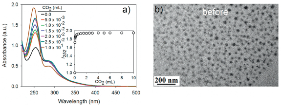| Fig. 2. (a) Absorption spectra of PM (0.10 mg/mL ×1.5 mL) upon CO2, where the inset shows the plot of the normalized absorption intensity at 252 nm (Ⅰ252). (b) TEM images of HBP(OEG-IB) polymer micelles. | |