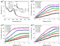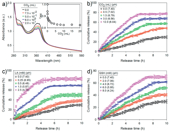 | Fig. 3. Absorption changes and release profiles of CPT-PM (0.20 mg/mL ×1.5 mL) upon CO2 (a, b), LA (c) and GSH (d). The inset showing the normalized absorption changes at 366 nm (Ⅰ366). | |