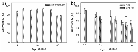 | Fig. 4. In vitro cell viability of HeLa cells co-cultured with HBP(OEG-IB) (a), free CPT and CPT-PM (b) for 48 h. | |