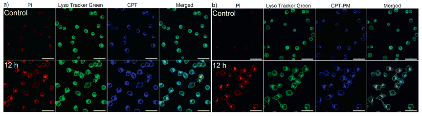 | Fig. 5. CLSM images of HeLa cells co-cultured with free CPT (a) and CPT-PM (b) at 1 μg/mL CPT for 12 h, respecctively. Fleuroscent PI, lyso tracker green and CPT were used to label the nuleus and lysosomes of HeLa Cells. The scale bars represent 50 μm. | |