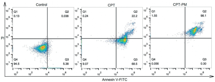 | Fig. 6. Flow-cytometric analysis of annexinV-FITC/PI dual-staining of HeLa cells co-cultured with free CPT and CPT-PM at CPT concentration of 5 μg/mL for 24 h. | |