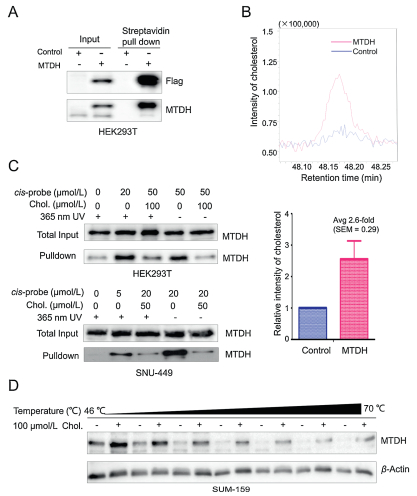 | Fig. 1. Identification and validation of MTDH-cholesterol interaction. (A) SFBControl or SFB-MTDH was transfected into HEK293T cells. MTDH was purified with Streptavidin beads (S-beads) and immunoblotted with antibodies against Flag and MTDH. (B) Relative enrichment intensity of cholesterol from the control or SFBMTDH transfected cells. (C) HEK293T and SNU-449 cells were incubated with a cissterol probe or cholesterol and then irradiated with or without 365-nm UV light. After the pre-clear and CuAAC click reaction, samples were immunoblotted with antibody against MTDH. (D) Increased thermal stability of MTDH caused by the binding with cholesterol in SUM-159 cells was measured by the temperaturedependent cellular thermal shift assays. Data in (B) is presented as mean ± SEM. The experiments were repeated five times. Chol., cholesterol. See also Fig. S2 in Supporting information. | |