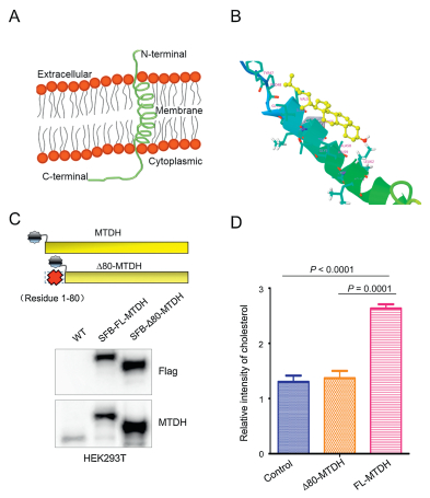 | Fig. 2. The N-terminal alpha-helix transmembrane domain of MTDH interacts with cholesterol. (A) The transmembrane alpha-helix domain was predicted at residues 49–74 of MTDH using Phyre2. (B) The binding mode between cholesterol (yellow) and MTDH (rainbow). This binding mode is calculated by DockingServer based on the structure information of cholesterol and the alpha-helical segment of MTDH. (C) Upper panel: schematic representation of the full length MTDH and N-terminal alpha-helix excluded MTDH. Lower panel: HEK293T cells were transfected with the SFB-tagged full-length MTDH or fragment of D80-MTDH. MTDH and the fragment were immunoblotted with antibodies against Flag. (D) Relative intensity of cholesterol enrichment from the control, SFB-Δ80-MTDH and SFB-FL-MTDH transfected cells. See also Fig. S3 in Supporting information. Data in (D) is presented as mean ± SEM. Statistical significance was determined by a two-tailed, unpaired Student's t-test. The experiments were repeated three times. FL, full length. | |