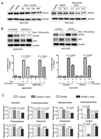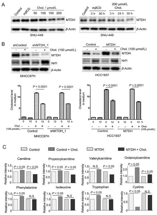 | Fig. 3. Identification of cholesterol as a functionally interacting metabolite of MTDH. (A) Immunoblotting of MTDH and β-actin in SNU449 cells with cholesterol or mβCD treatment. The cells were treated time and dose-dependently, respectively. (B) Upper panel: Immunoblotting of MTDH, Nrf1 and β-actin in the MTDH shRNA-transduced MHCC97H cells and the MTDH overexpressed HCC1937 cells, with or without cholesterol treatment. Lower panel: Quantification of cholesterol levels in cell culture medium after 12 h culture (n = 6). Statistical significance was determined by a two-tailed, unpaired Student's t-test. (C) The levels of carnitine, propionyl-carnitine, valeryl-carnitine, octanoyl-carnitine, phenylalanine, isoleucine, tryptophan and cystine in the control vector or MTDH transduced cells under cholesterol treatment (n = 6). Statistically significance of metabolites: P < 0.05 by two-way ANOVA. Data in (B) and (C) are presented as mean ± SEM. h, hours; Chol., cholesterol; N.S, not significant. See also Fig. S4 in Supporting information. | |