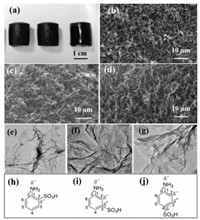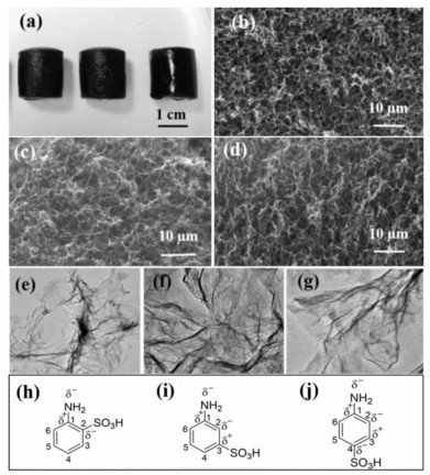| Fig. 1. (a) Macroscopic photographs of the o-SNGF (left), m-SNGF (middle) and p-SNGF (right). The SEM images of o-SNGF (b), m-SNGF (c) and p-SNGF (d). TEM images of images of o-SNGF (e), m-SNGF (f) and p-SNGF (g). The SNGF were all synthesized under the condition of ABSA/GO = 3/1 (mass ratio) and pH 3.4. The electron distribution in benzene ring for o-ABSA (h), m-ABSA (i) and p-ABSA (j). | |