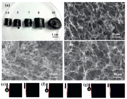 To study the effect of pH on the morphology of the resultant m-SNGF, the pH value of the hydrothermal solution ranging from 3.4–10.0 were investigated. Fig. 2a illustrates that the size of the resulting SNGF is gradually enlarged with increasing pH value. The SNGF is rather loose and fragile when the pH value is 10.0. SEM images (Figs. 2b-d) further confirm that higher pH value attributes to larger pores and discrete pore walls. The weak interconnection in pore wall then results in the structural collapse. As shown in Figs. 2e-g, when the water droplet contacts to the m-SNGF surface, the droplet immediately spreads out on the m-SNGF surface because of the hydrophilicity of the m-SNGF. The m-SNGF synthesized at pH 3.4 shows unobserved surface change after the contact with water droplet. However, the surface of the m-SNGF synthesized at pH 7.0 appears slightly depressed after contacting with water droplet. The surface collapse becomes obvious for the m-SNGF synthesized at pH 10.0 solution. The results indicate that the preparation of m-SNGF under an acidic condition ensures the integrity and stability of the 3D skeleton.