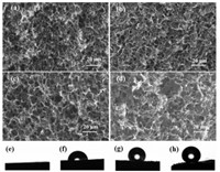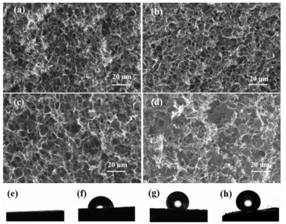 | Fig. 3. The SEM image of m-SNGF (a), m-SNGF/400 (b), m-SNGF/800 (c) and m-SNGF/1000 (d). The water contact angles of m-SNGF (e), m-SNGF/400 (f), m-SNGF/800 (g) and m-SNGF/1000 (h). | |