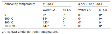 Table 1 The oil and water contact angles of the o-SNGF, m-SNGF and p-SNGF under different annealing temperature. |