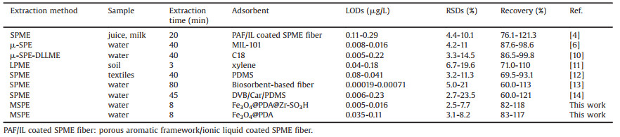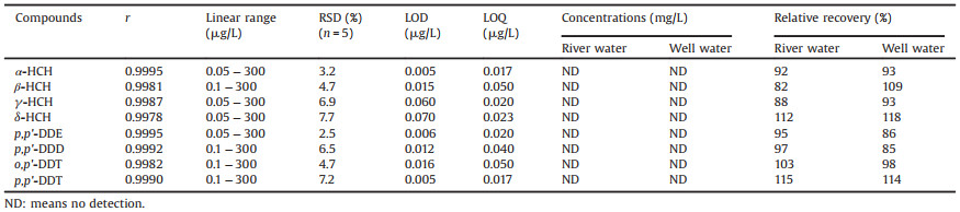 To make the performance advantages of this proposed method convictive, a comparison between this method and other reports has been made. As shown in Table 2, this proposed method exhibited the comparable and even superior performance to others in terms of LOD, precision and recovery and so on. All the results confirm that this proposed method is a promising tool for the extraction and determination of OCPs in water samples.