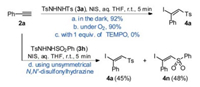 To further understand the mechanism of this method, more conditional experiments were tested under the standard conditions. As shown in Schemes 7a and b, no differences were observed when the reaction proceeded in the dark or under O2 atmosphere. None of the product 4a was detected in the presence of one equiv of TEMPO (Scheme 7c). These results indicated that our method may go through a radical addition pathway and the tosyl radical (Ts·) is generated by an oxidative decomposition of 3a. As was expected, two products 4a and 4n were obtained when unsymmetrical N, N'-disulfonylhydrazine 3h was used as a substrate (Scheme 7d).