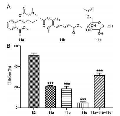 | Fig. 2. (A) The structures of compounds 11a-c. (B) Inhibition of ADP-induced rabbit platelet aggregation by 11a-c alone or in combination in vitro. Rabbit platelet suspensions were pre-incubated with tested compounds (0.1 mmol/L) at 37 ℃ for 5 min, followed by addition of ADP (10 μmol/L). Data are expressed as the mean ±SD of each compound from six independent experiments. ***P < 0.001 vs. S2. | |