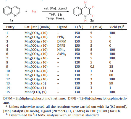 In 2014, we reported a manganese-catalyzed [4 + 2] annulation reaction of N-H imines and alkynes with the evolution of H2 gas [15]. Mechanistic studies indicated the involvement of MnH(CO)5 as a true catalytic species in the reaction. Curious whether the simple MnH(CO)5 species could enable the hydrogenation reactions without using previous external pincer or bidentate ligands, we commenced our study with the hydrogenation of quinoline 1a by using simple Mn2(CO)10 as a catalyst (Table 1). The expected 1, 2, 3, 4-tetrahydroquinoline 2a was formed quantitatively when the hydrogenation was carried out with 5 MPa of H2 and 10 mol% of Mn2(CO)10 in THF at 150 ℃ (entry 1). While phosphine ligands were detrimental to the reaction, NPh3 and AsPh3 showed no influence on the reaction outcome (entries 2–6). Changing the reaction temperature suggested that 130 ℃ was the optimal (entries 7 and 8). Variations on the pressure of H2 showed that the reaction could proceed at lower pressure even at 1 atm, yet in decreased yields (entries 9–12). The amount of Mn2(CO)10 could be reduced to 5 mol%, however, 1 mol% of the catalyst failed in the reaction (entries 13–14). The use of MnBr bold (CO)5 instead of Mn2(CO)10 gave also a quantitative yield of 2a (entry 15).
