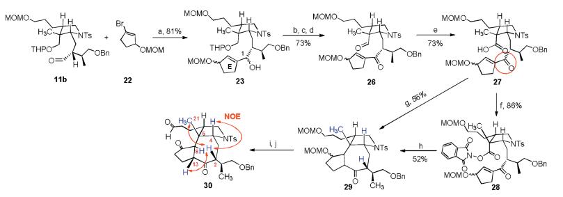 After successfully construction of the ACE tricyclic system of daphnicyclidin A, using the same strategy, we studied the synthesis of the ACE tricyclic system of dehydroxymacropodumine A. As showed in Scheme 5, treatment of 22 with tBuLi in THF at 78 ℃ followed by addition of 11b, a cyclopentene was attached to afford secondary alcohol 23 in 81% yield. Oxidation of the alcohol with Dess-Martin reagent, deprotection of the THP group and oxidation of the resulting primary alcohol give aldehyde 26 in 73% yield. Further oxidation of the aldehyde group to carboxylic acid gave 27, which was subjected to MacMillan's photocatalyst condition. To our delight, using 1 mol% Ir[dF(CF3) ppy]2(dtbbpy)PF6 as catalyst in deoxygenated DMF, a household 26 W fluorescent light bulb irradiation about 16 h, the conjugate addition product 29 was delivered in 56% yield. We also examined Overman's condition by conversion of carboxylic acid 27 to N-hydroxyphthalimide ester 28. Using the same reaction condition with that of 20 to 21a, compound 29 was also delivered in 52% yield. The molecular formula of29 was established as C37H47NO6S by HRMS at m/z 672.3565 [M+H]+ (calcd. 672.3569), consistent with its structure. The NMR spectra of 29 were complicated because it is a mixture of several diastereoisomers. To further identify the structure of 29, the MOM group was removed and the resulting hydroxyl groups were converted to carbonyl group afforded 30. The molecular formula of 30 was established as C33H41NO6S by HRMS at m/z 602.2554 [M[+Na]+ (calcd. 602.2547). The NMR of 30 indicated that it is mainly a single compound and its 1H and 13C NMR signal were assigned by detailed analyses of 1D and 2D NMR spectra (Table S4 in Supporting inforamtion). The NOESY cross-peaks of H-2 (δH 3.68) to H-4 (δH 3.46), H-4 to H-21 (δH 0.67) and H-2 to H-13 (δH 3.29) showed that H-2, H-4, H-13 were at the convex side and the H-8 (δH 3.18) on the concave side (Fig. S4 in Supporting information). The configuration of C-8 is identical to the configuration of C-8 in compound 21a.