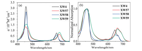 The UV-vis absorption spectra of XW4 and XW57-XW59 in THF are shown in Fig. 2a, with the corresponding data listed in Table S1 (Supporting information). XW58 displays a typical intense Soret band around 459 nm and a less intense Q band around 664 nm. Compared with XW4, the bulky dihexyloxyphenyl groups introduced in XW58 cause negligible red-shift of both Soret and Q bands. Similarly, slightly red-shifted absorption spectrum is observed for XW59, compared with that of XW57. On the other hand, incorporation of the BTD groups into XW57 and XW59 leads to dramatically broadened absorption and red-shifted Q-bands centered around 683 nm with a striking absorption onset at ca. 734 nm. This observation can be rationalized by the strength-ened intramolecular charge transfer (ICT) effect due to the strong electron-deficient character of the BTD unit. The broadened and red-shifted absorption spectra are favorable for light-harvesting and are expected to afford better cell performance. Upon anchoring to 3 μm thick TiO2 films, all three dyes exhibit blue-shifted Q bands relative to those in THF (Table S1 and Fig. S14 in Supporting information) because of the combined effect of deprotonation and aggregation [42]. Notably, insertion of the auxiliary BTD unit in XW57 results in a blue shift of ca. 19 nm, more obvious than that of 16 nm observed for XW4, denoting aggravated H-type aggregation [15] resulting from BTD unit induced π-conjugation framework extension. A similar trend is also observed between XW58 and XW59.